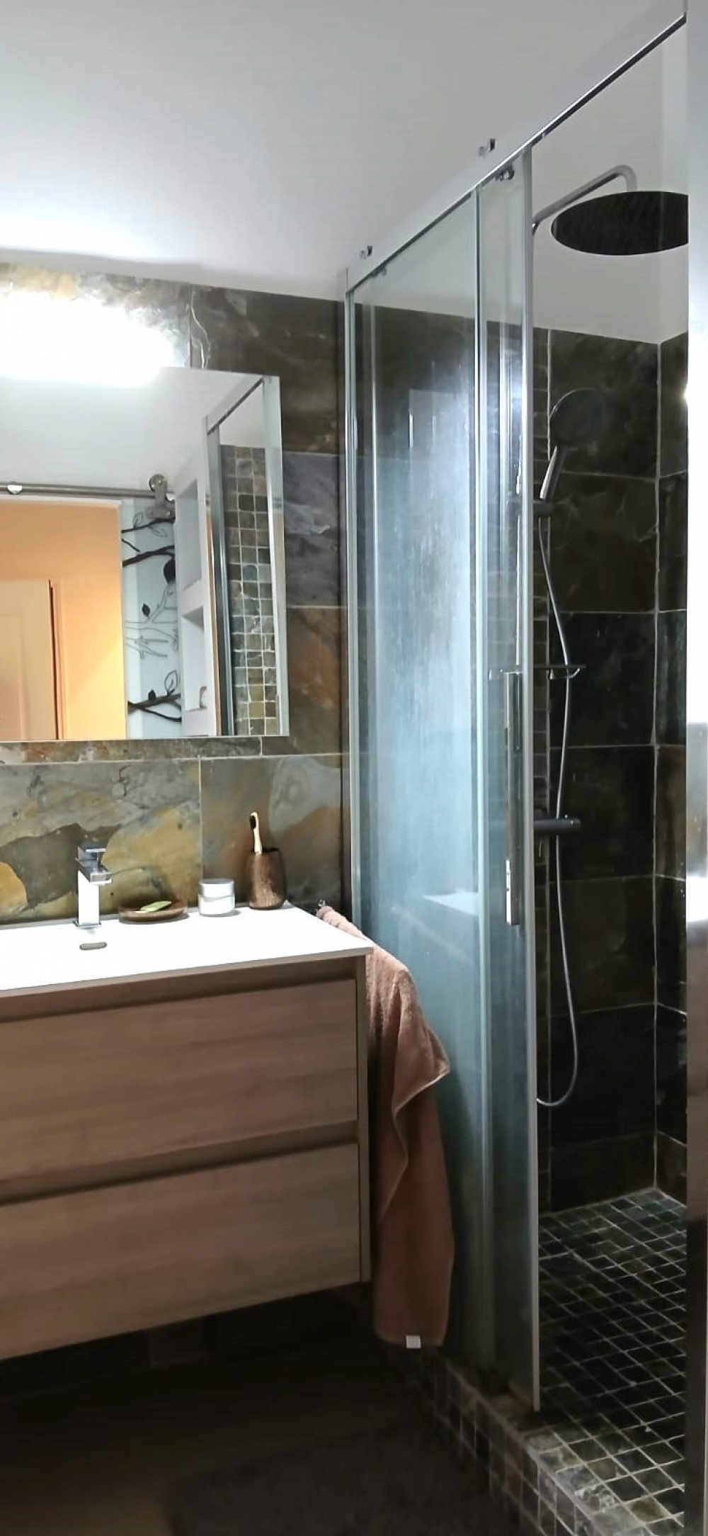 L'appartement est situé au deuxième et dernière étage .Il se compose de deux belles chambres climatisées avec placards muraux,d'un wc indépendant et son lave mains,d'une salle de bain agréable avec une douche spacieuse en pierre.