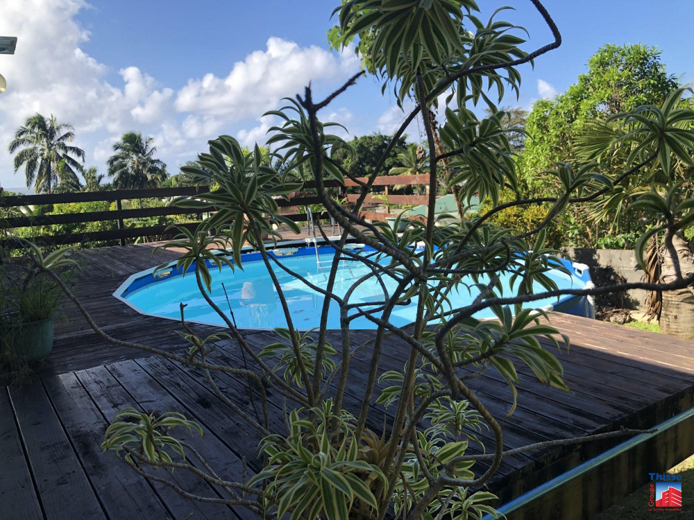 À vendre à AFAAHITI : maison 5 pièces de 75 m² et de 744 m² de terrain avec piscine. La maison inclut trois chambres et une salle d'eau. En annexe, elle bénéficie de deux places de parking et d'une terrasse.