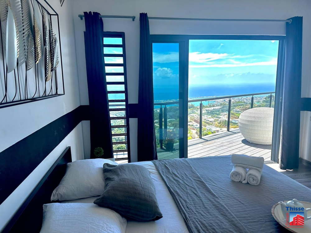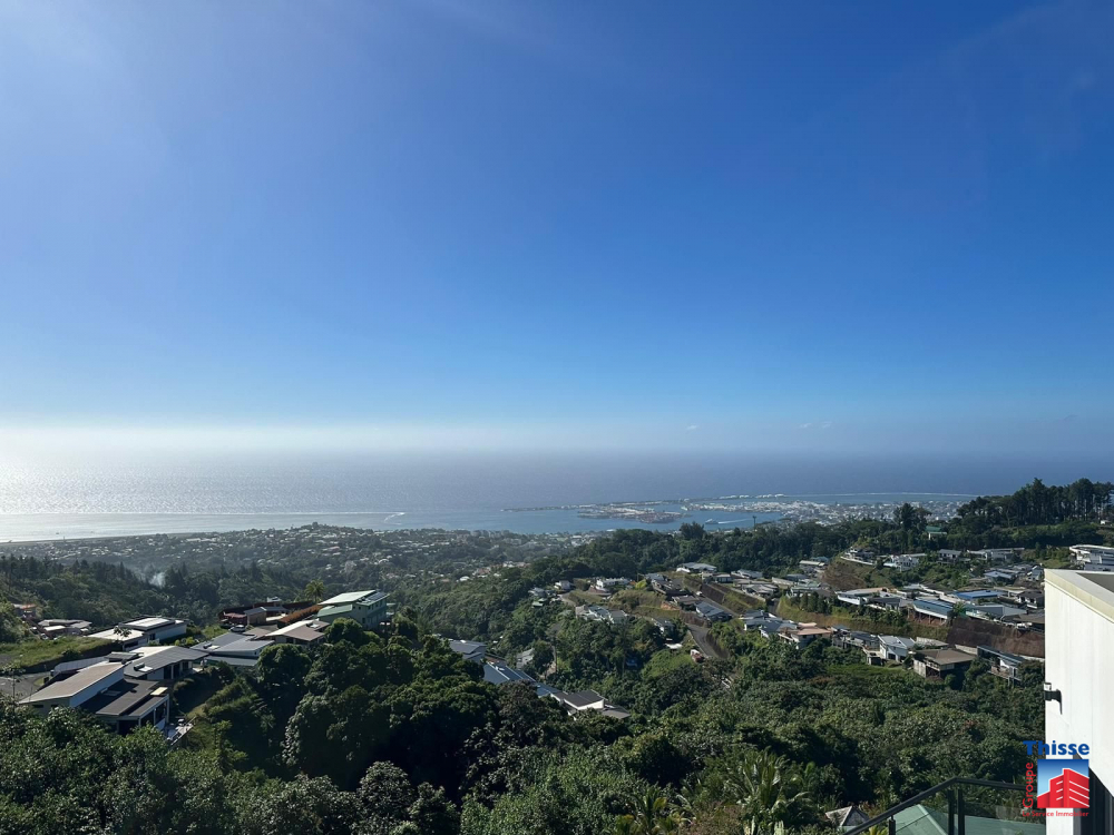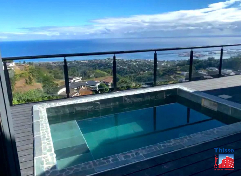 La maison dispose d'un grand deck de 43,5 m2 et d'une belle piscine avec une vue sur la rade de Papeete.