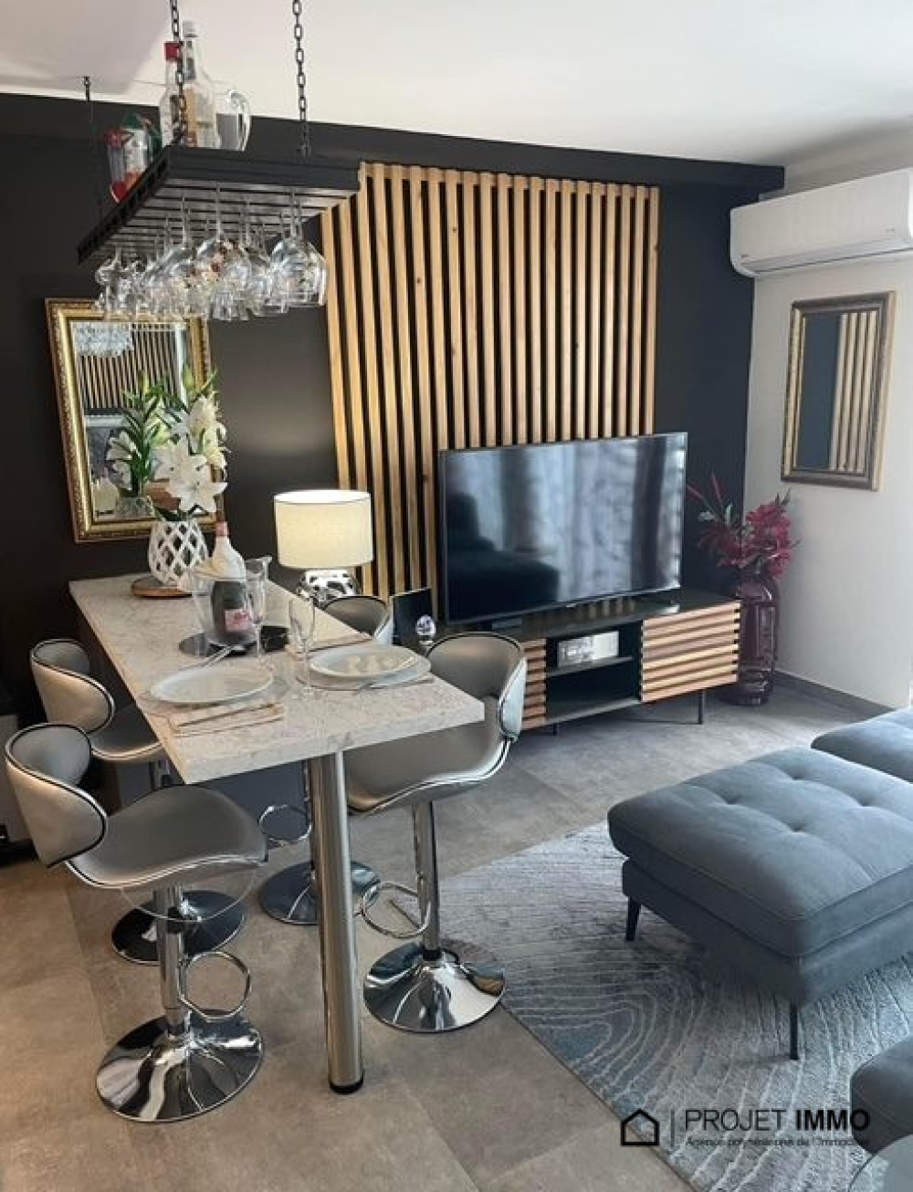 Appartement entièrement décoré, cuisine équipée et aménagée, salon, chambre et salle de bain.