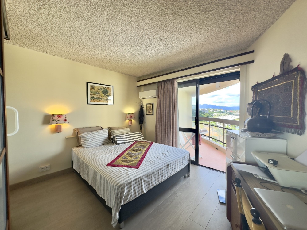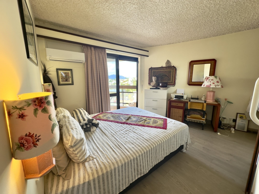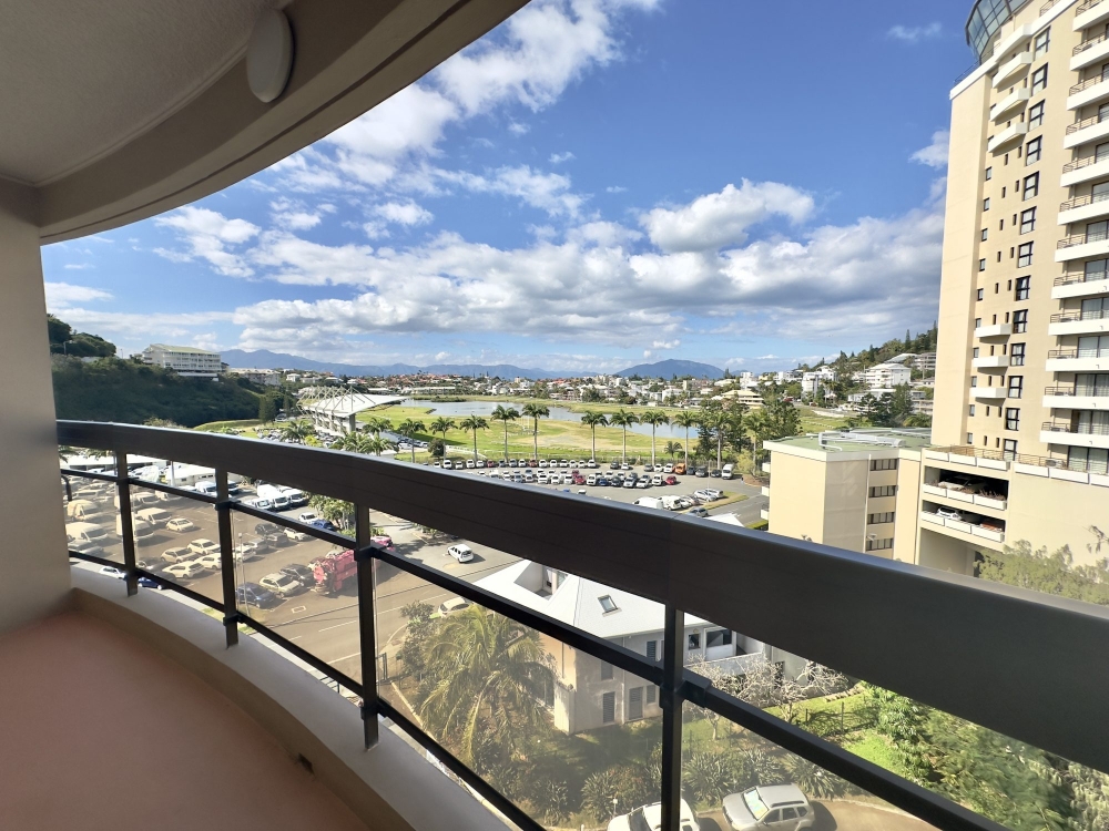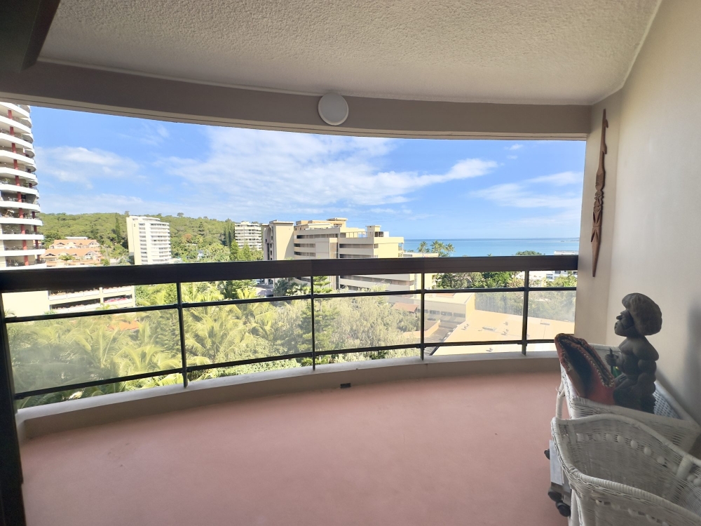Séjour lumineux avec brasseur d'air, donnant sur une terrasse couverte avec volet roulant et vue mer sur les îlots côté Anse Vata