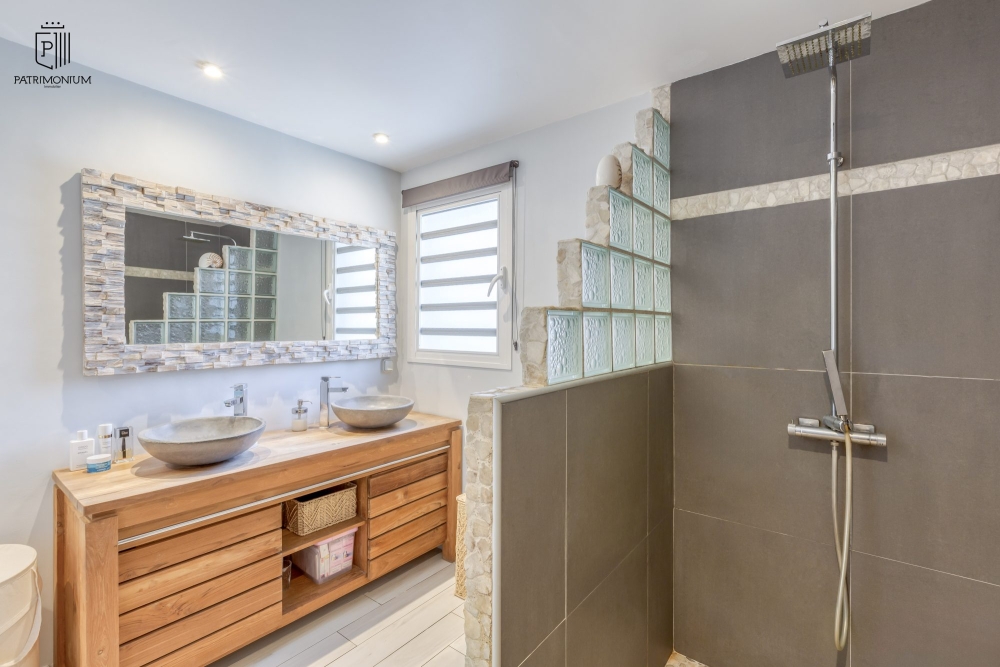 La villa dispose également d'une salle d'eau moderne, d'un WC séparé pour plus de praticité, ainsi que de deux chambres en enfilade et d'une troisième chambre, offrant ainsi un espace de repos confortable à chacun des membres de la famille.