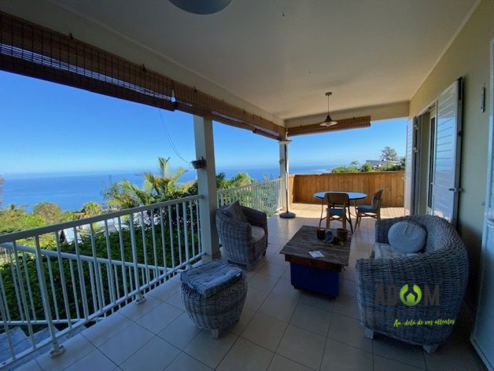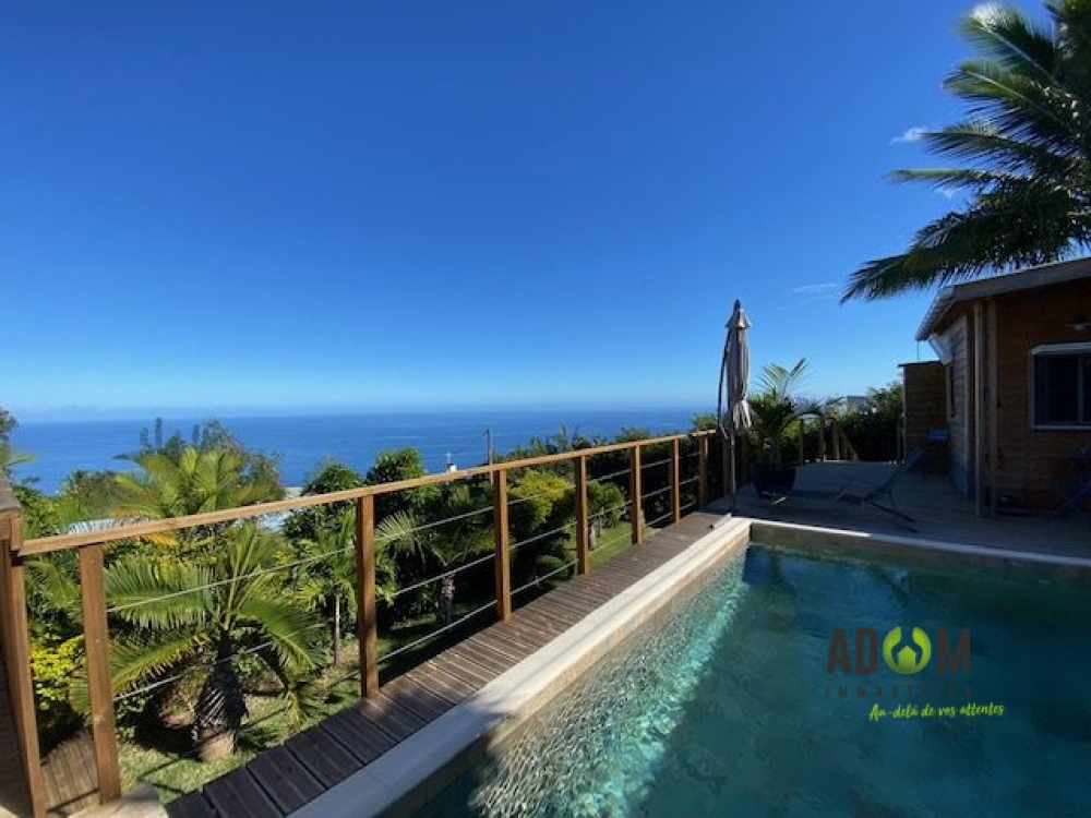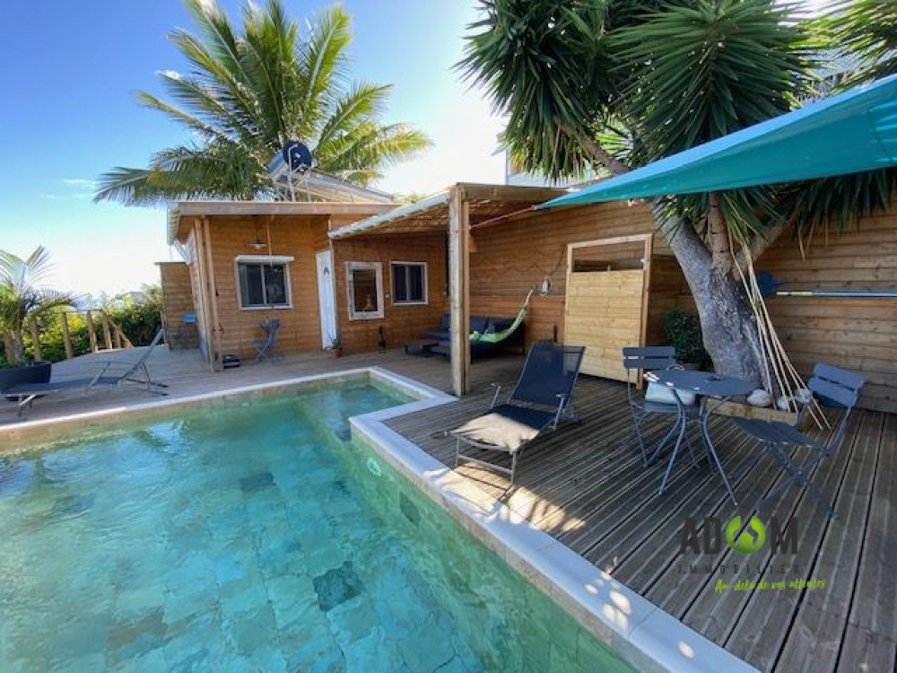 Cette villa F4 lumineuse et entièrement rénovée dispose d'une varangue avec une grande terrasse en Deck et piscine avec vue mer imprenable.