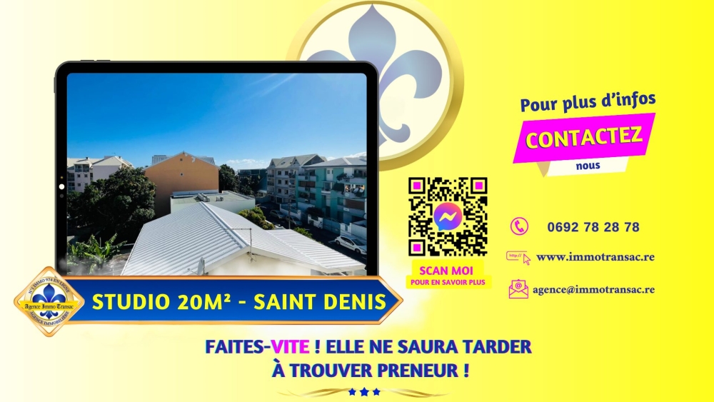 Pour en savoir plus sur ce STUDIO À VENDRE à Saint Denis, contactez l'AGENCE IMMO TRANSAC REUNION ou complétez le formulaire ci-dessous. Nous serons ravis d'échanger avec vous sur ce bien et de parler de votre PROJET IMMOBILIER à l'île de la REUNION.
