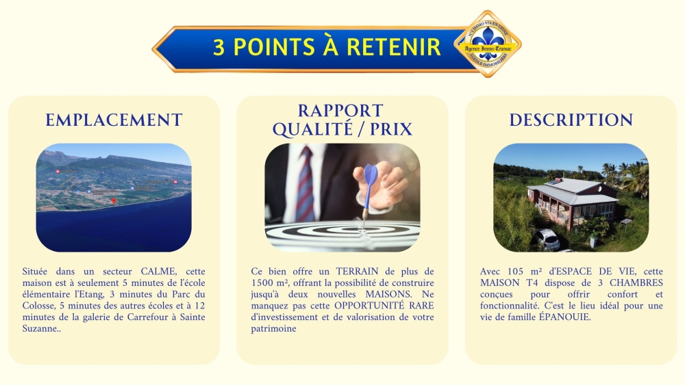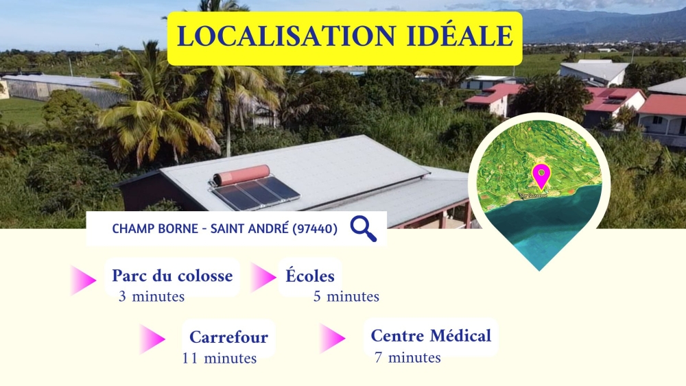 Située dans un quartier CALME ET SÉCURISÉ de Saint-André, cette maison se trouve à seulement 5 minutes de l'école élémentaire l'Etang, 3 minutes du Parc du Colosse et 12 minutes de la galerie Carrefour à Sainte-Suzanne. Vivez le meilleur des deux mondes : la SÉRÉNITÉ du quartier et la PROXIMITÉ des commodités.