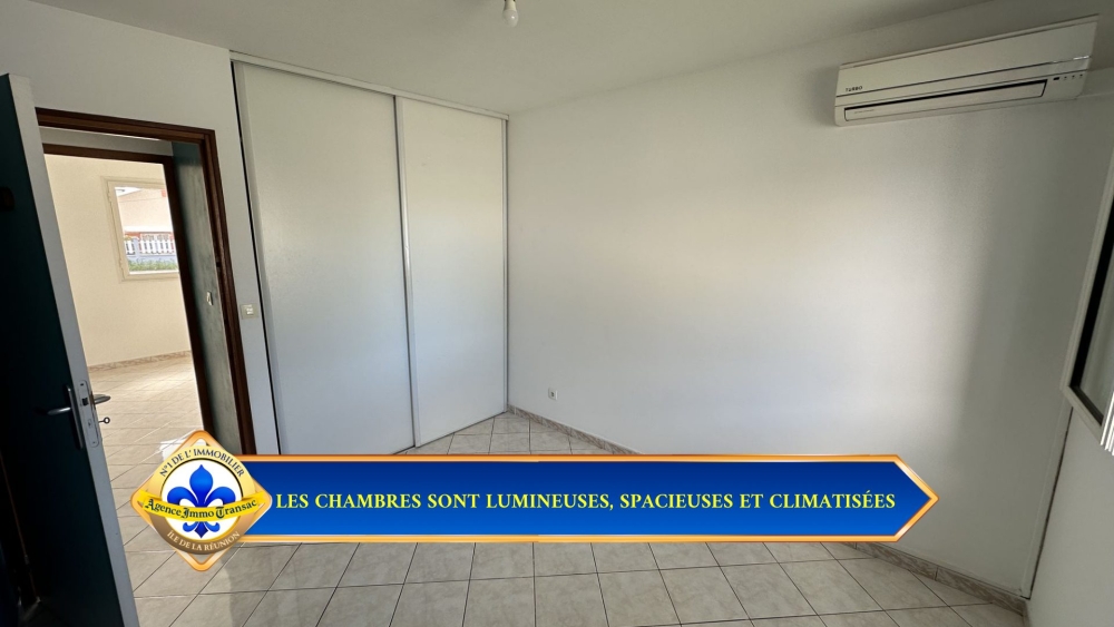 - La troisième chambre, équipée d'une climatisation murale, assure un confort optimal en toutes saisons. Une vue plus large de la troisième chambre montre des placards intégrés, parfaits pour le rangement.