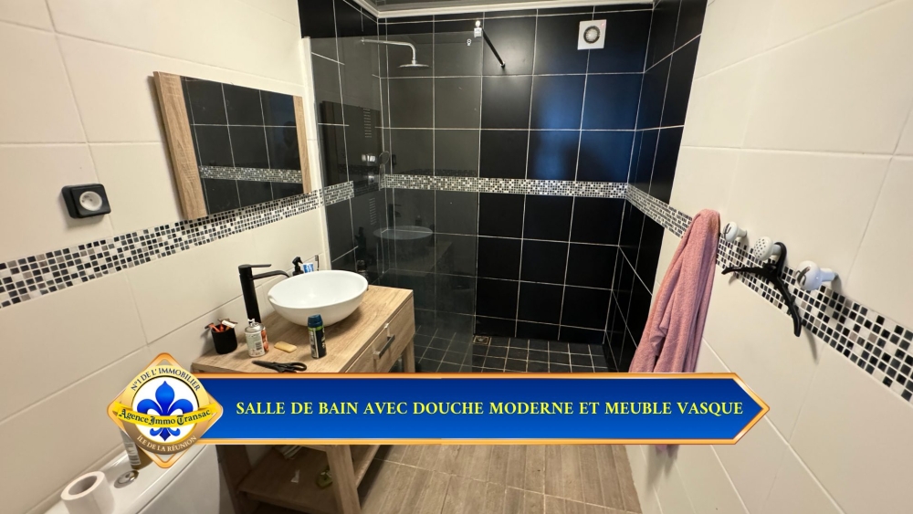 UNE SALLE DE BAIN MODERNE ET ÉLÉGANTE : Entièrement rénovée, la salle de bain principale dispose d'une douche à l'italienne, d'un meuble vasque en bois et de détails contemporains qui apportent une touche de raffinement.