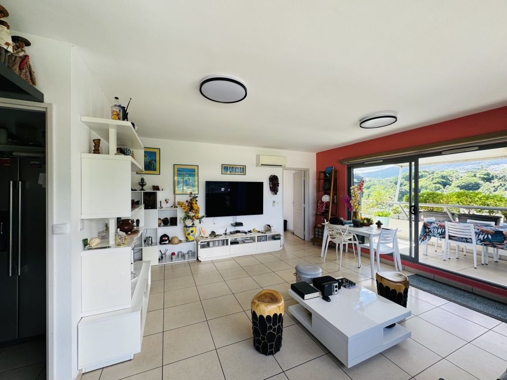 Comprenant : une entrée, un dégagement, une cuisine équipée et aménagée avec un cellier attenant, un séjour climatisé, deux chambres climatisées, une salle de bain avec WC, et une spacieuse terrasse d'environ 22 m2 offrant une vue sur Moorea et la montagne.