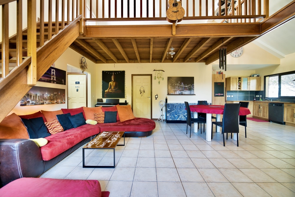 À l'étage, une mezzanine offre un espace supplémentaire polyvalent.