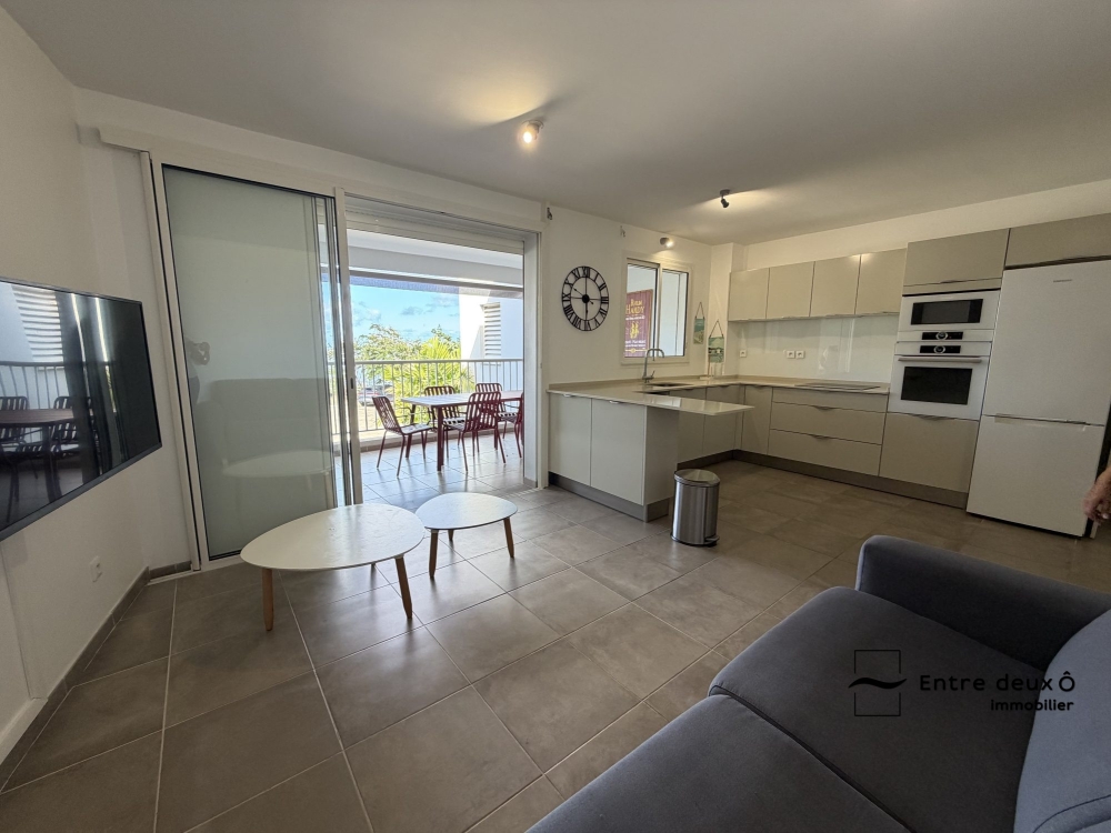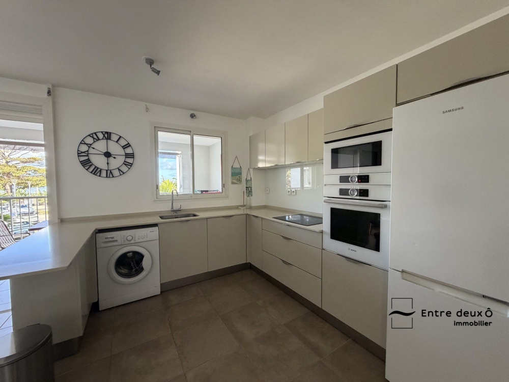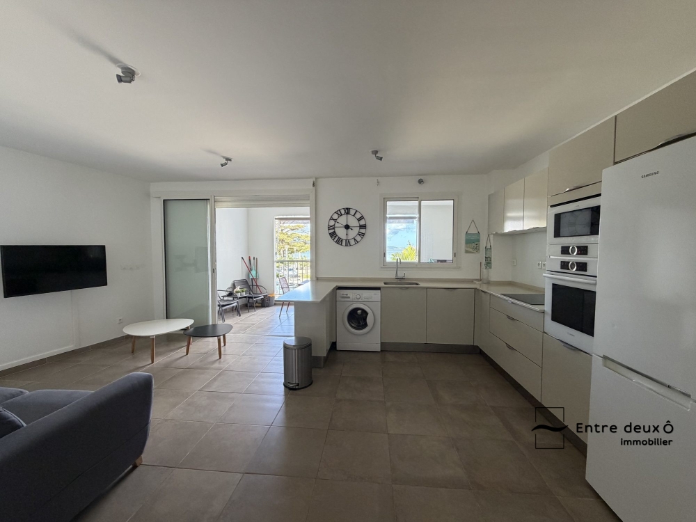 Ce pièce de vie vous mènera à une terrasse de 14m2 donnant vue mer