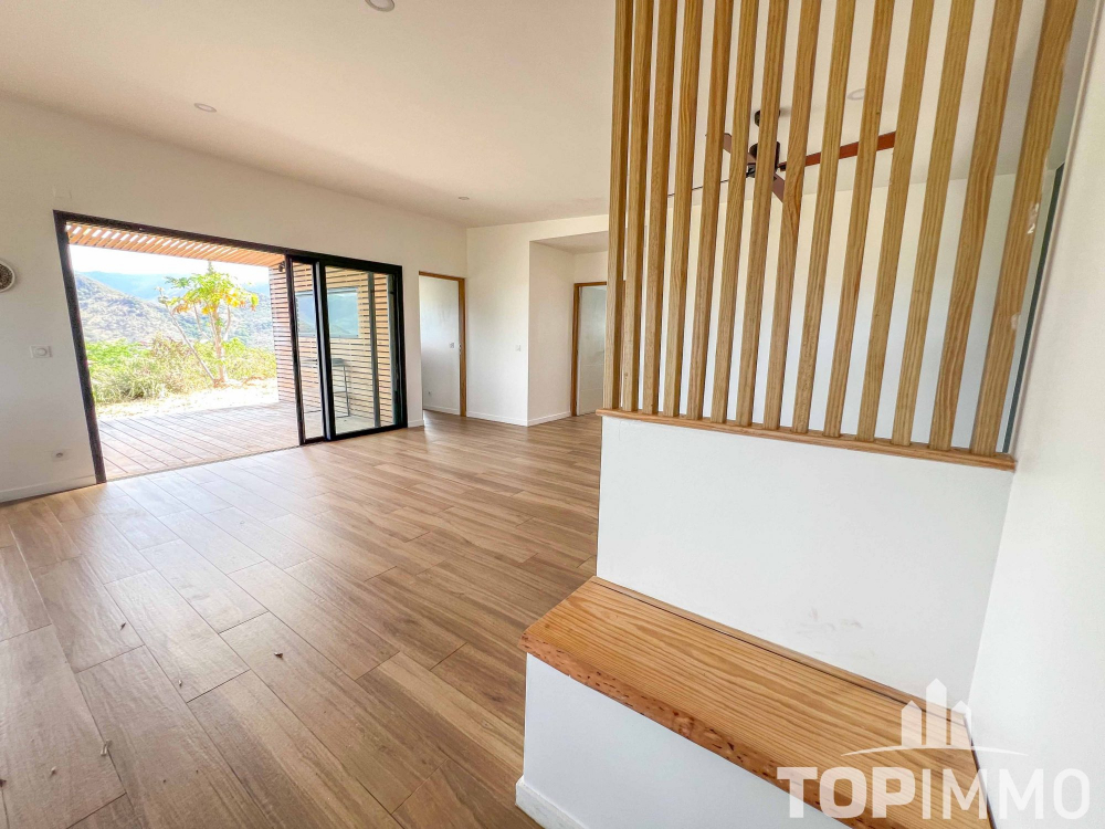 Le séjour lumineux s'ouvre sur une spacieuse terrasse couverte de 28 m², offrant une vue panoramique sur les montagnes, sans aucun vis-à-vis. La cuisine aménagée et équipée comprend un four intégré, une hotte, un évier et un îlot central avec de nombreux rangements et plusieurs prises électriques. Une buanderie/garde-manger, attenante à la cuisine, facilite l'organisation du quotidien. Une grande fenêtre fixe permet en outre de profiter d'une vue imprenable sur la baie et les montagnes depuis la cuisine.
