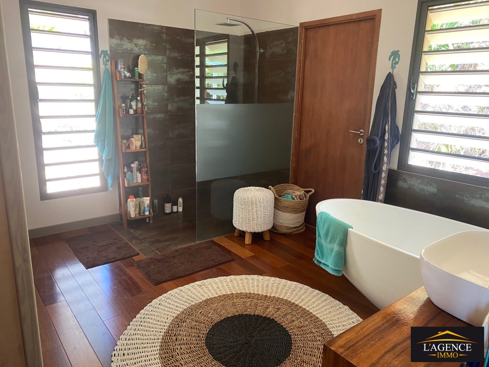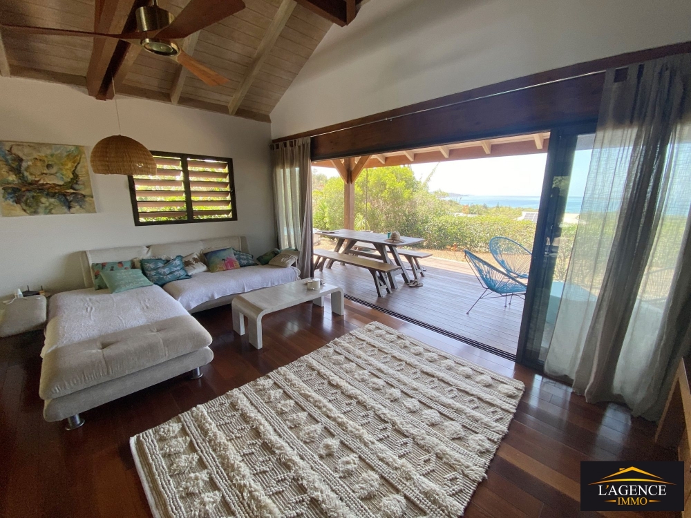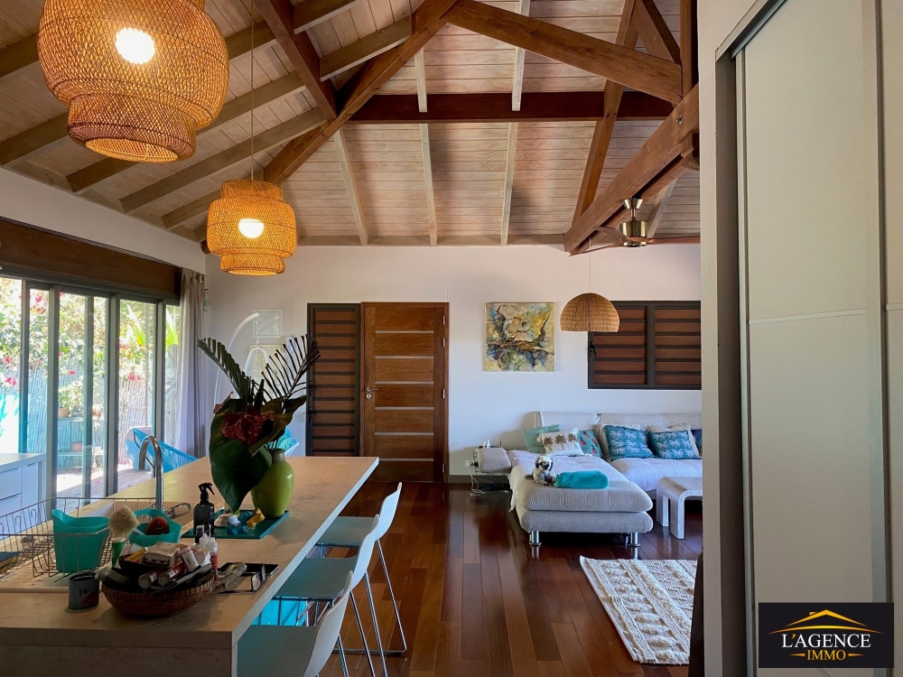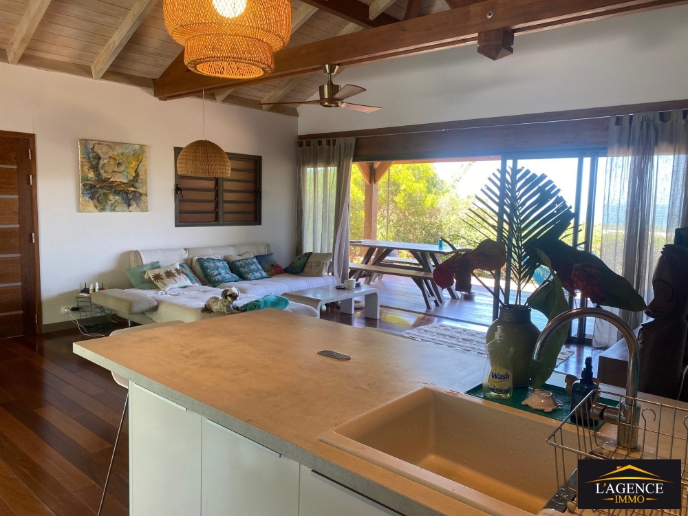 Bien niché dans un cadre paisible et verdoyant, avec une vue imprenable sur le lagon. La villa principale offre un séjour / cuisine de plus de 45 m² , deux chambres confortables dont une climatisée, une salle de bains moderne avec douche et WC, une buanderie.