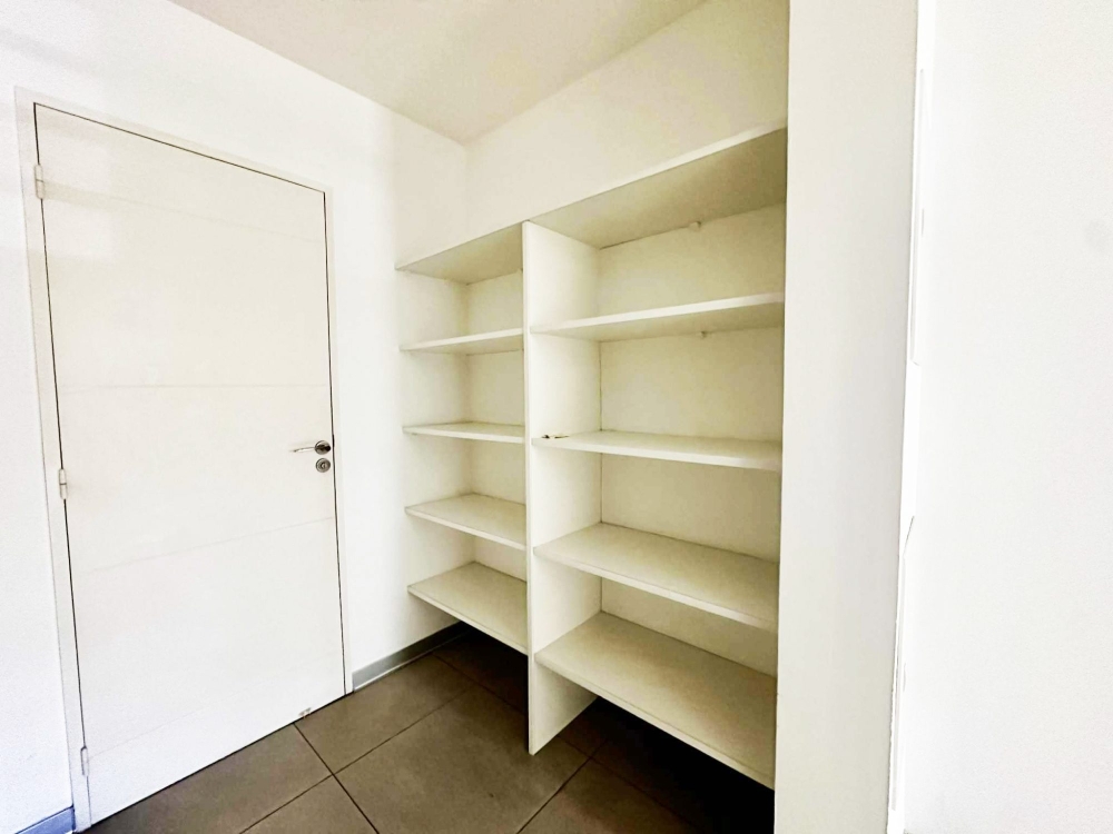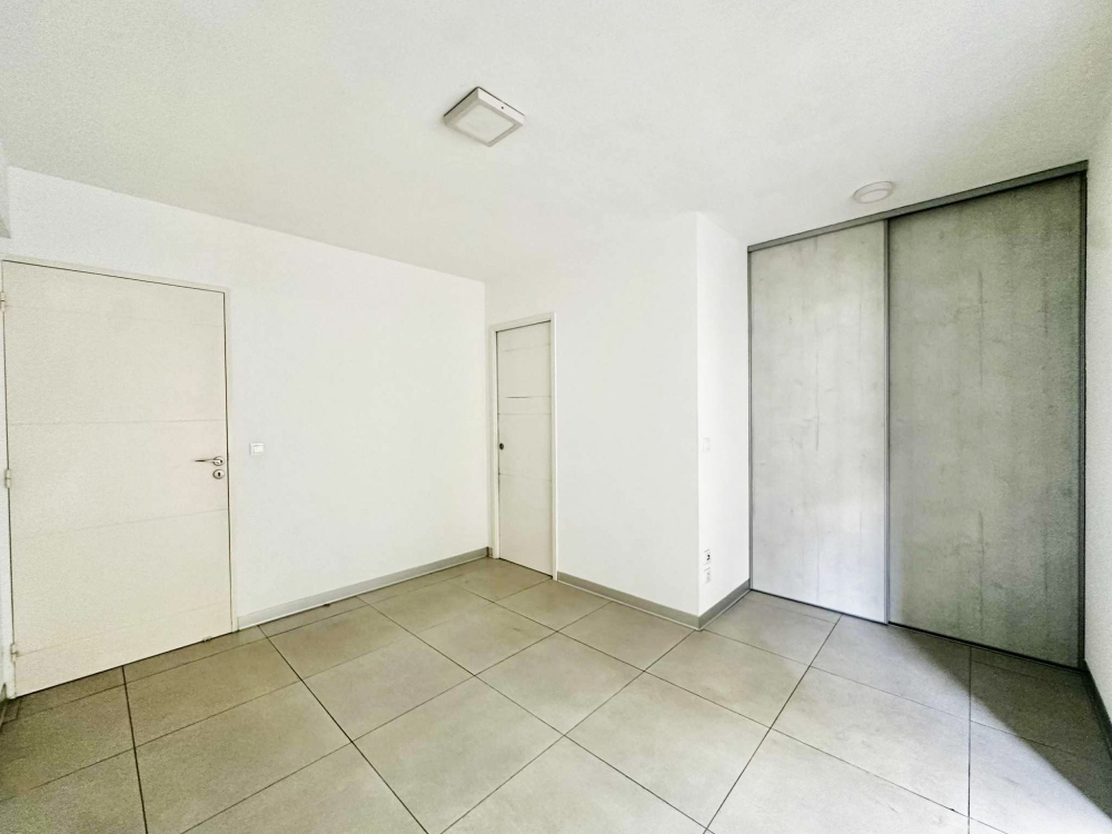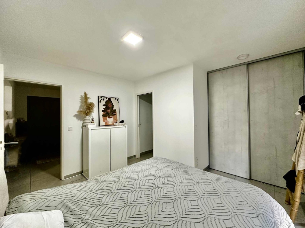 La chambre climatisée de 11,74 m² est équipée de volets roulants, d'un balcon privatif et d'un dressing. La salle d'eau de 2,06 m² avec meuble vasque moderne et les WC séparés assurent confort et praticité. Un cellier de 3,53 m² complète l'espace nuit pour vos besoins de rangement.