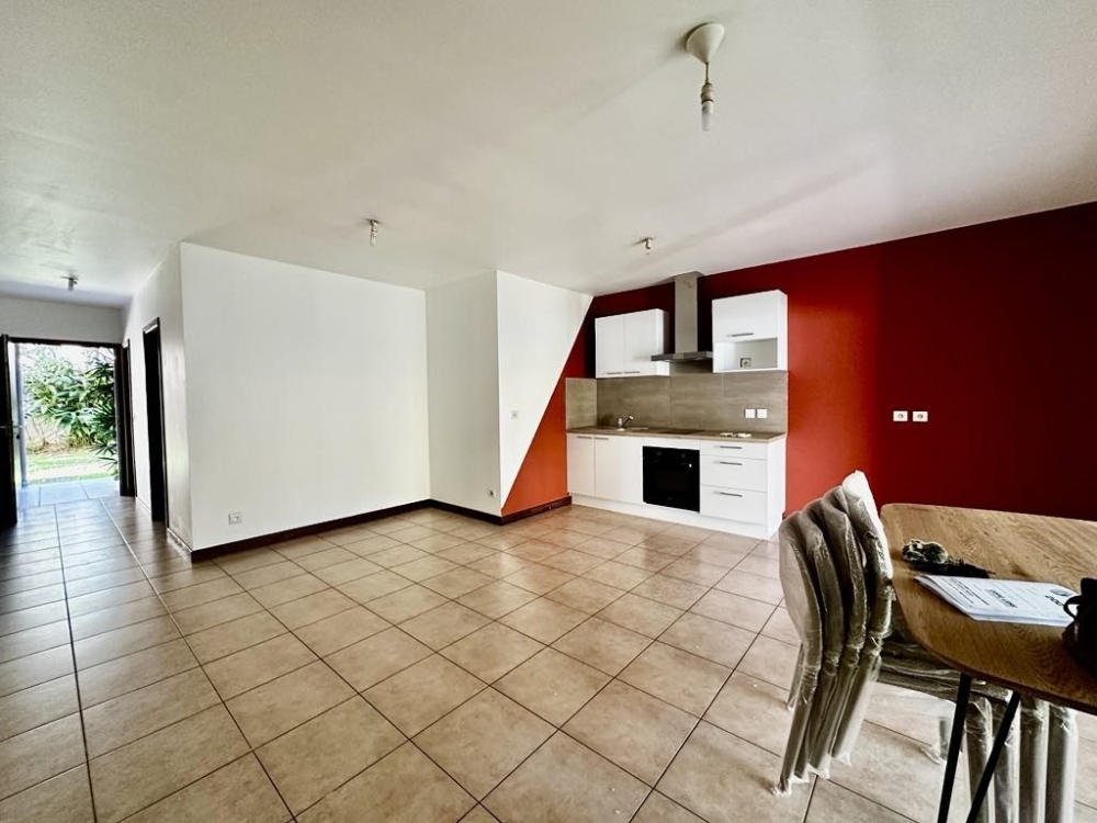 Le séjour lumineux de 26,6 m² est ouvert sur une cuisine équipée (four, plaque, hotte), créant un espace convivial et pratique au quotidien. La terrasse couverte prolonge naturellement le séjour pour profiter pleinement de l'extérieur.