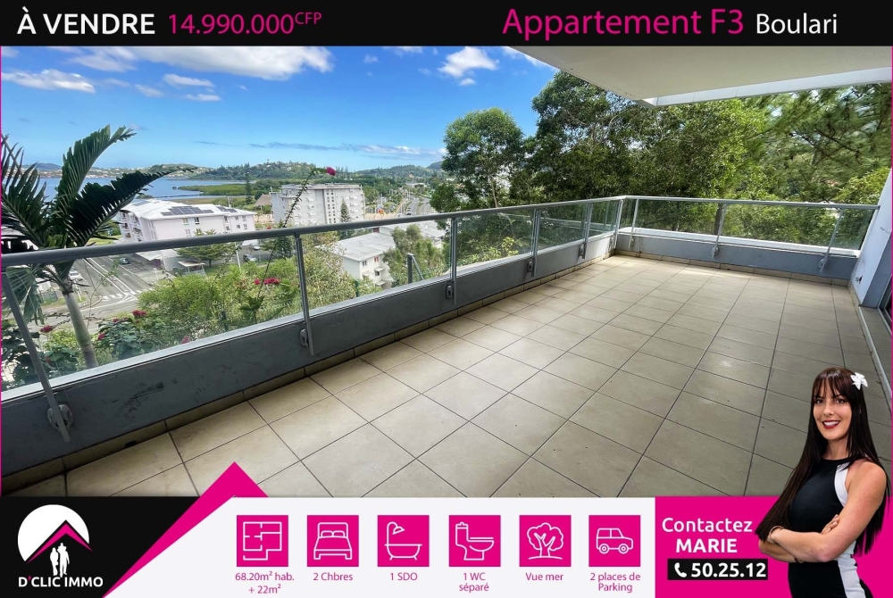 Idéalement situé en position dominante au R+1 du Bâtiment EEVA à la Résidence BUTTE ESTIENNE datant de 2017 (sécurisée avec ascenseur) dans le quartier de Boulari, l'agence D'CLIC IMMO vous propose un spacieux appartement aux prestations modernes de type F3 de 68.20m² +22m² de terrasse avec une vue mer imprenable.