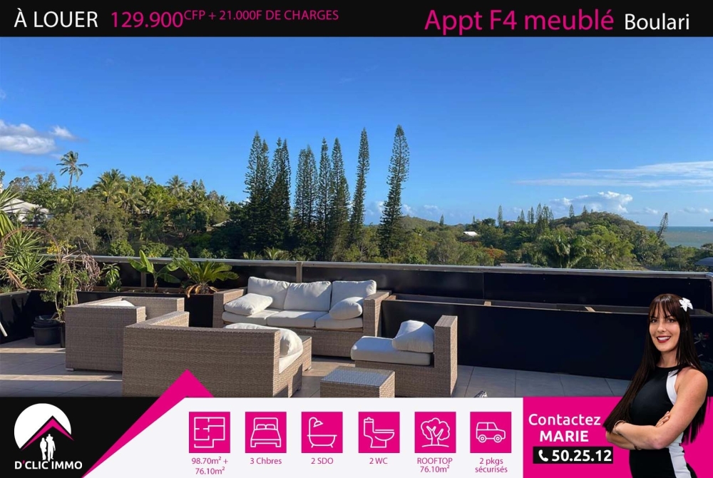 Idéalement situé à Boulari, proche des commerces, marché et écoles, et de toutes commodités l'agence D'CLIC IMMO vous propose en exclusivité un spacieux appartement de type F4 entièrement meublé et équipé de 98.70m² + 76.10m² de terrasse situé en ROOFTOP au 5e et dernier étage de la résidence sécurisée avec ascenseur 'BUTTE ESTIENNE'.