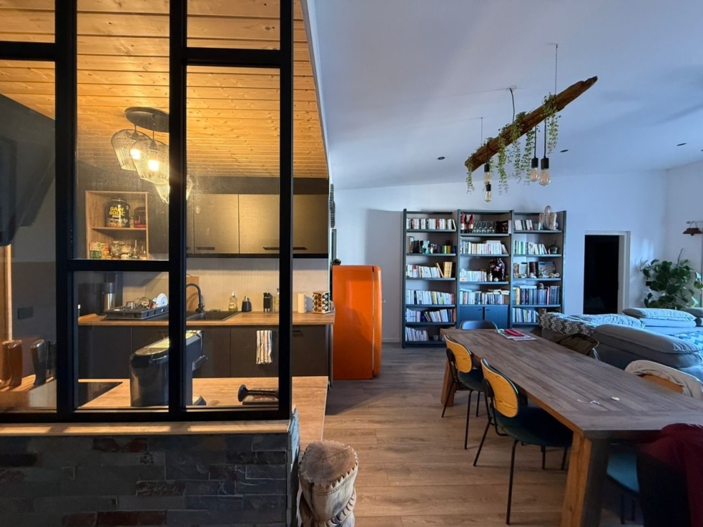 Vous disposerez en partie jour d'une belle cuisine ouverte meublée et équipée (four, plaque induction, hotte, frigo, vaisselle, nombreux rangements), d'une grande buanderie avec pompe à chaleur / garde manger, le tout donnant sur une superbe un séjour lumineux de 39.90m² avec une superbe vue dégagée, sans vis à vis.