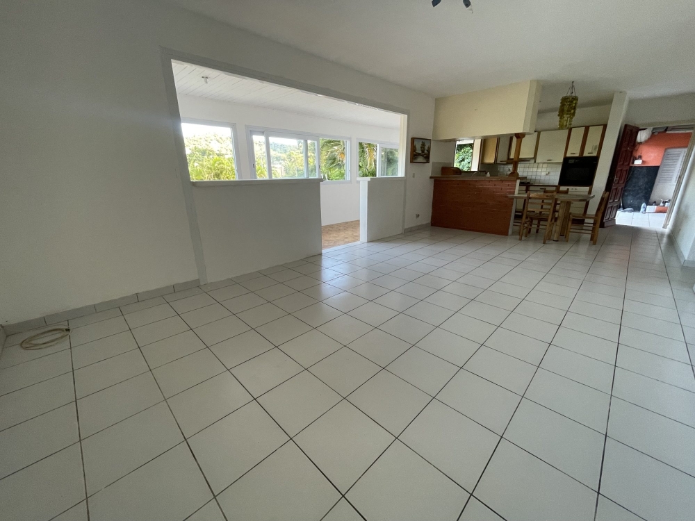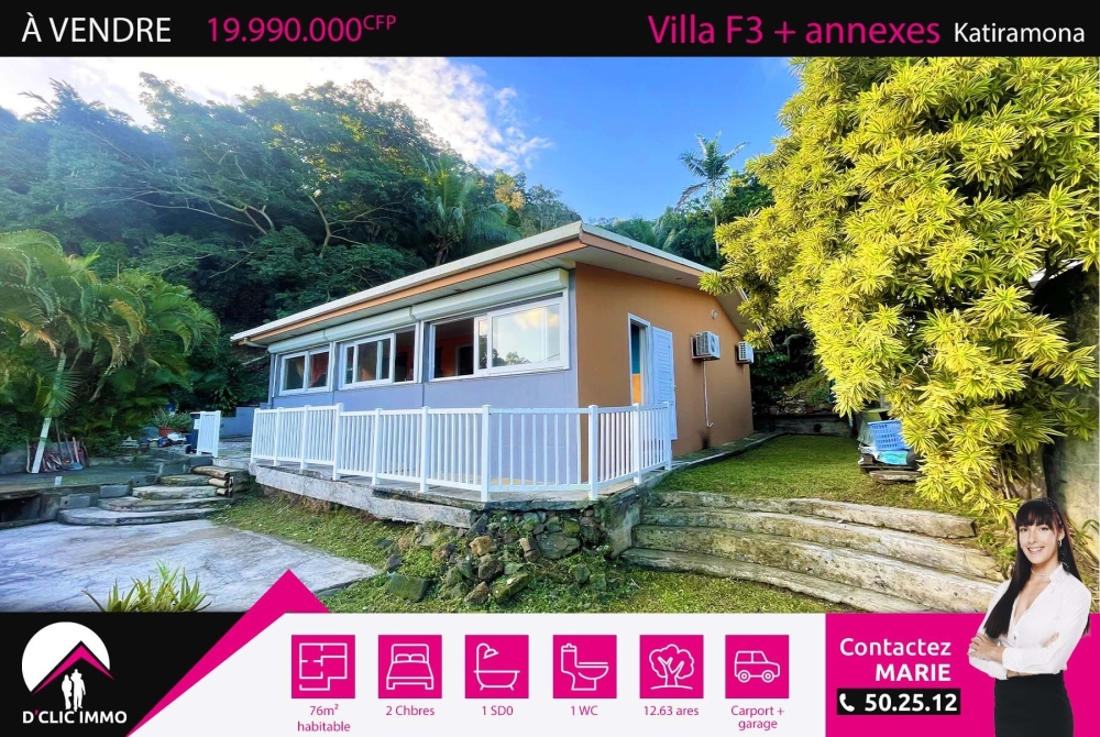 Située sur les hauteurs, dans le quartier résidentiel très calme de Katiramona, proche des écoles et de toutes commodités, l'agence D'CLIC IMMO vous propose une spacieuse villa individuelle de type F3 de plain pieds en construction traditionnelle datant de 2000, de 76m² habitable + 55m² de terrasses et annexes sur un beau jardin de 12.63 ares en limite de zone naturelle, avec une superbe vue dégagée.