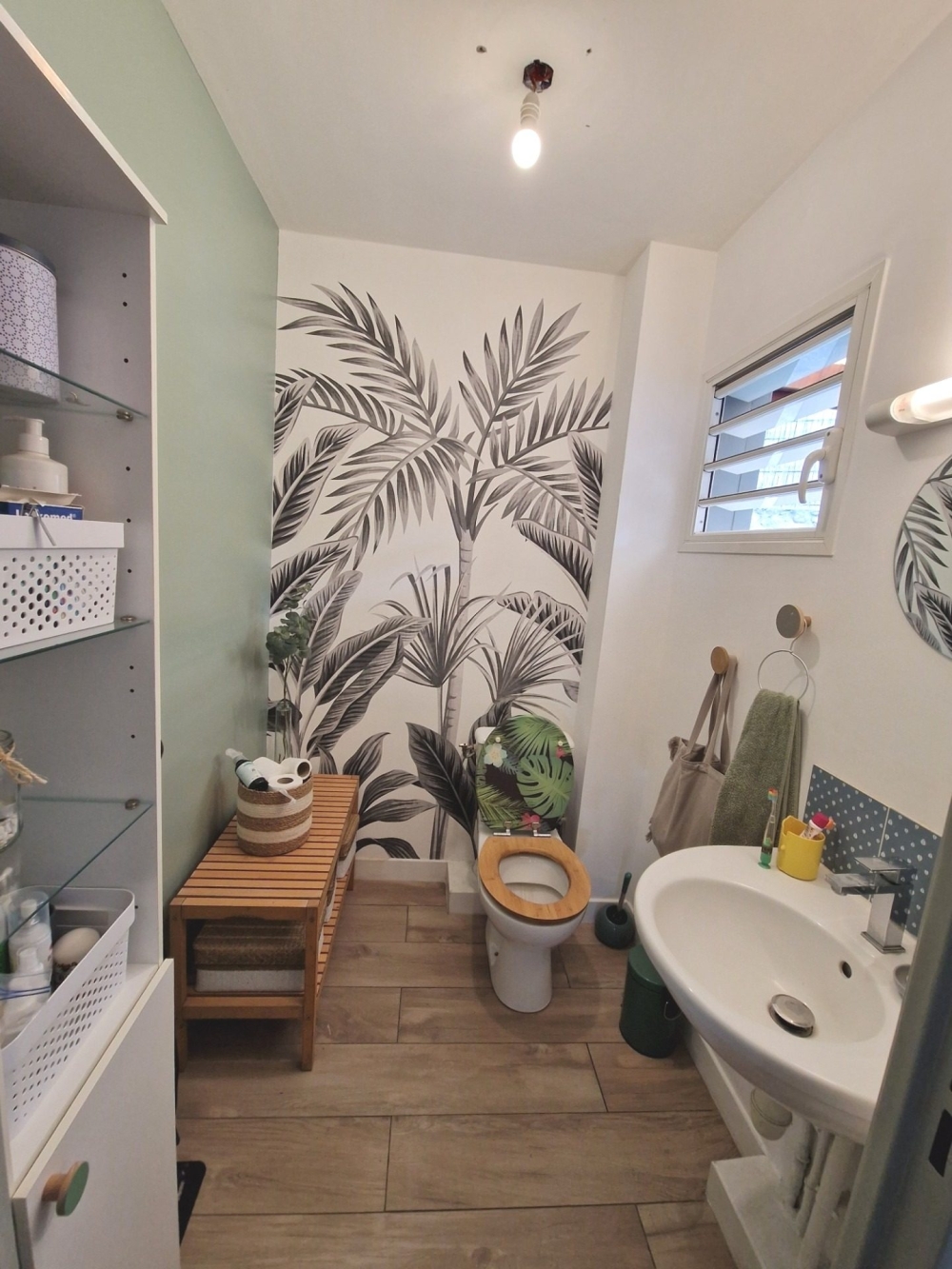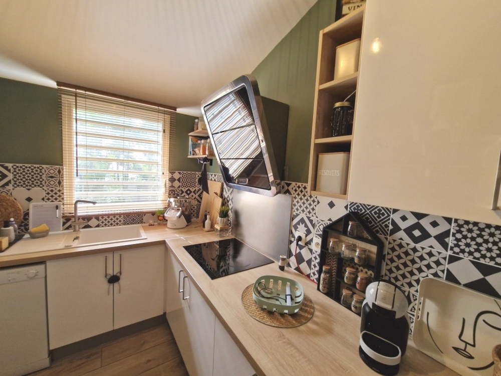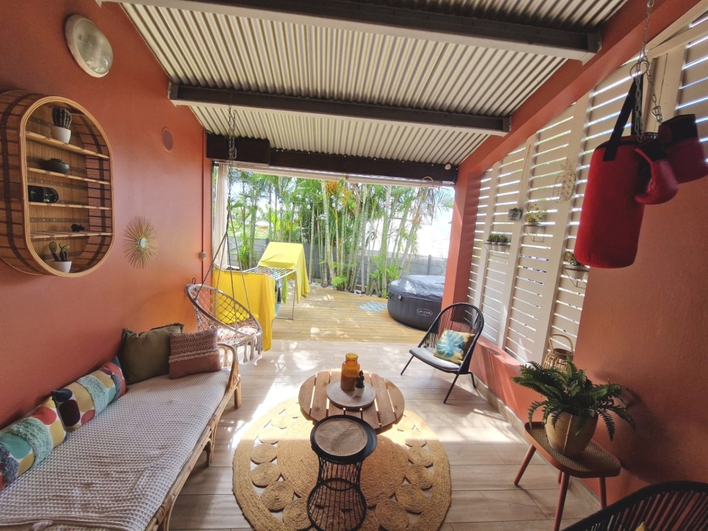 - Au rez de chaussée : entrée, un grand WC avec lave mains, une chambre avec placard ouvrant sur le jardinet arrière, un séjour ouvert vers la varangue, une cuisine équipée (meubles bas et hauts, plaque, hotte)