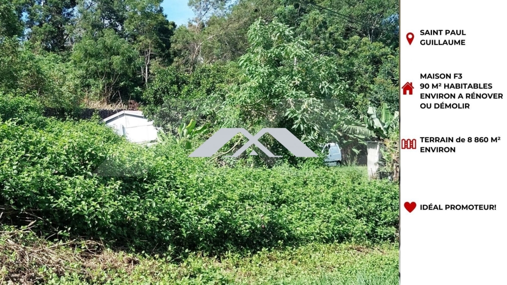 MAXImmo vous propose cette parcelle de 8860 m², dont environ 7500 m² en zone U6c permettant la construction en R+1+combles avec 60% d'emprise au sol. Située entre 850 et 875 m d'altitude, à 5-10 mn du Guillaume et à 20-25 mn de la route des tamarins elle possède plusieurs voies d'accès facilitant une division du terrain. Eau et électricité sont à proximité directes offrant plusieurs possibilités d'aménagement. Enfin une habitation d'environ 90 m², à rénover ou démolir, est déjà présente sur le terrain.