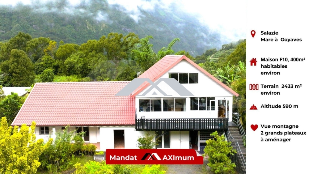MAXImmo vous propose à Mare à Goyaves, au coeur du cirque de Salazie (UNESCO), cette grande maison à rénover de 10 pièces, idéale pour un projet de gîte ou d'hébergement touristique.