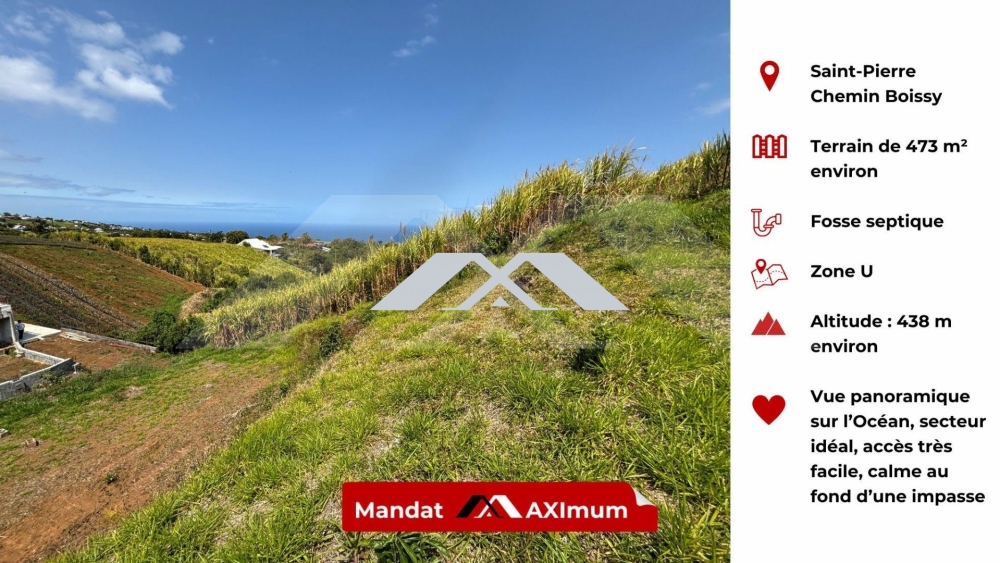 MAXImmo vous propose cette splendide parcelle constructible d'environ 473 m² dont 400 m² utile, située Chemin Boissy à Saint Pierre, à 438 m d'altitude et offrant une vue panoramique sur l'océan.