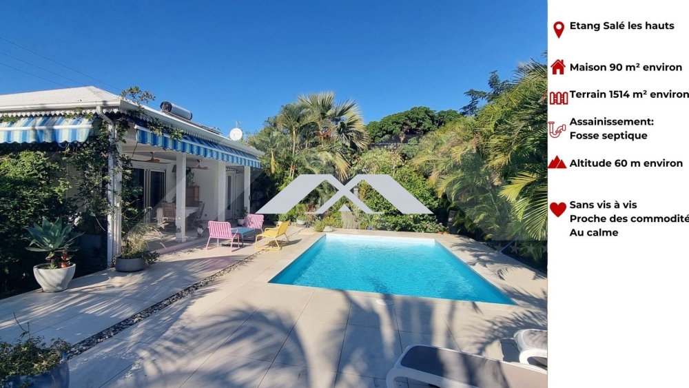 MAXImmo vous propose dans un emplacement idéal en fond d'impasse et à 2 pas du centre-ville de l'Etang salé les hauts cette superbe villa F4 de plain-pied d'environ 158 m² utile composée de 3 chambres, d'un séjour ouvert sur cuisine, d'une salle d'eau, d'une grande varangue et d'un garage.
