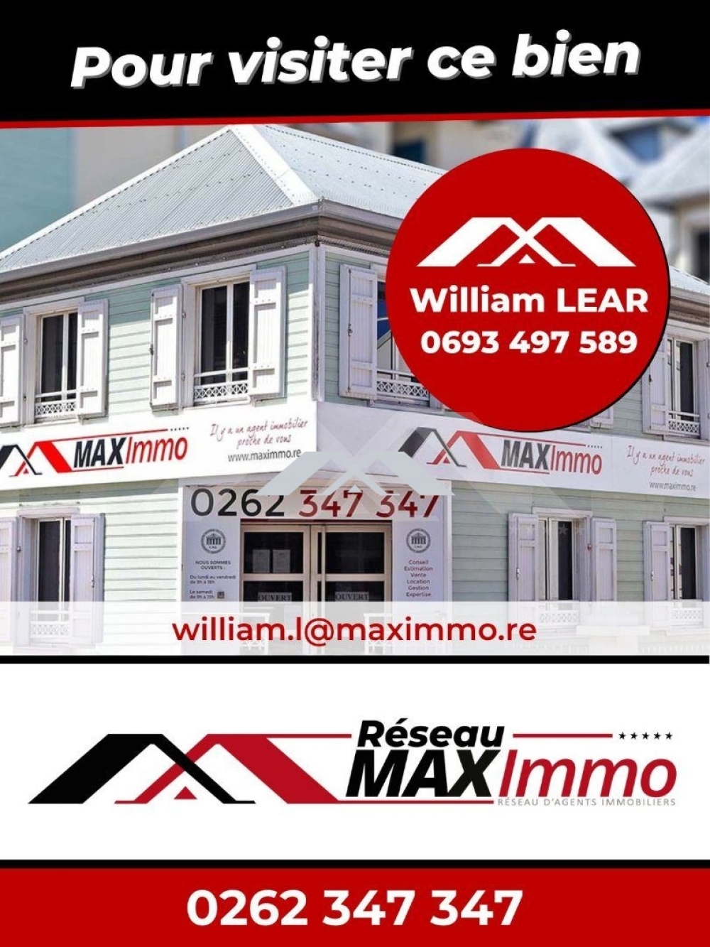 Réseau MAXImmo - Pour plus de renseignements contactez William.L au 06 93 49 75 89 ou par mail à william.l@maximmo.re OU Gaelle au 06 92 11 84 98 ou par mail à gaelle.a@maximmo.re