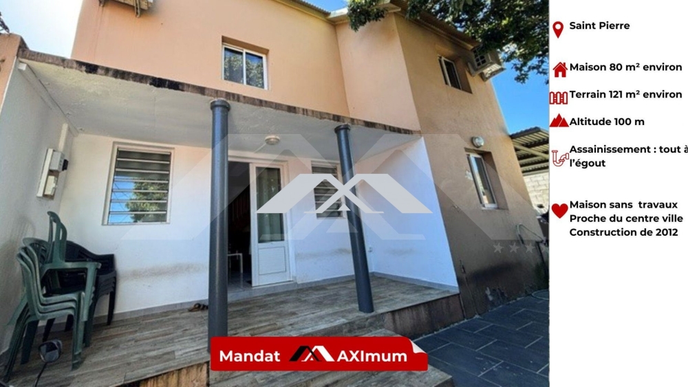MAXImmo vous propose cette maison d'environ 80 m² habitables située à 3 minutes de Saint Pierre centre; elle se compose d'un séjour d'environ 21m² ouvert sur la cuisine et 1 varangue à l'avant, et une belle terrasse de + 20 m² à l'arrière, un wc et une salle d'eau.