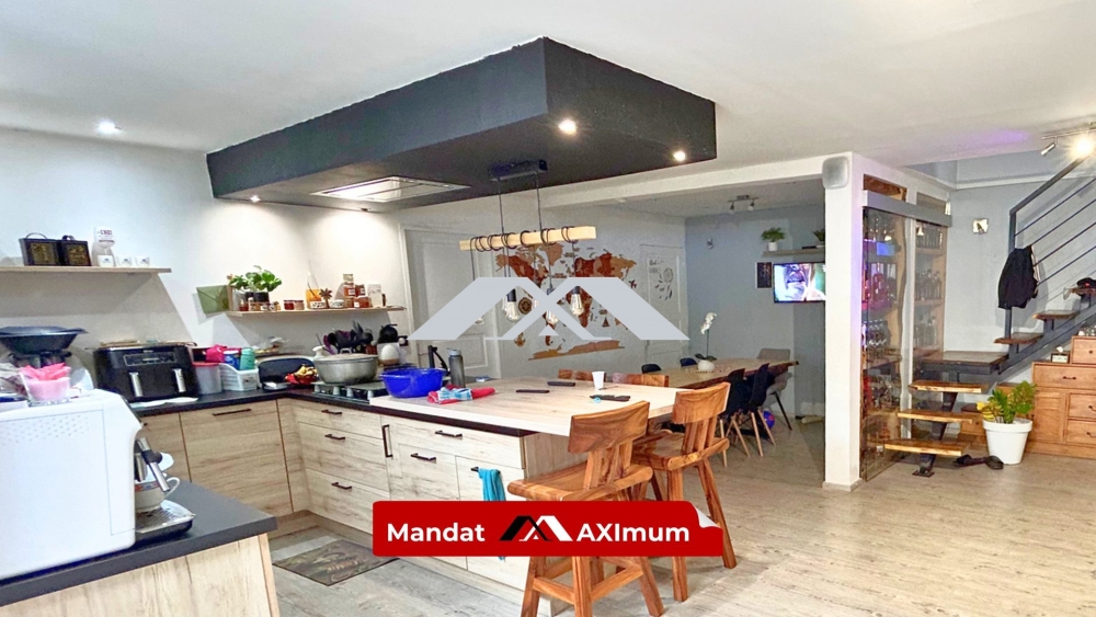La cuisine américaine et le coin repas d'environ 34 m² invitent aussi à profiter de moments familiaux autour de la table.
