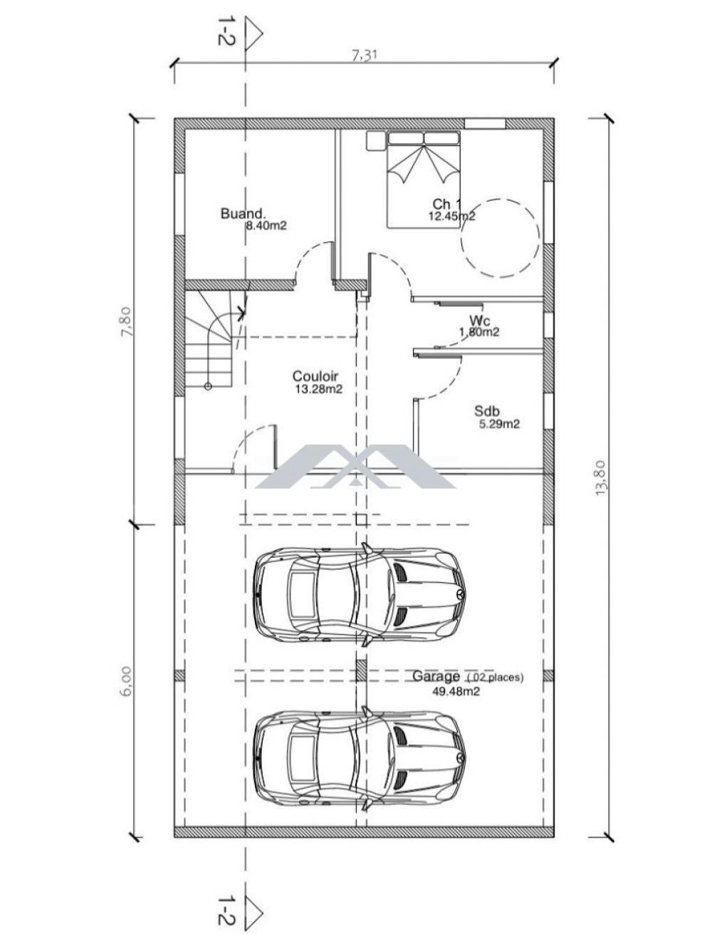 Edifiée sur une parcelle d'environ 371 m². Elle se compose au rez-de-chaussée d'une chambre, d'une salle d'eau, d'un wc, d'une buanderie et d'un double garage de près de 50 m².