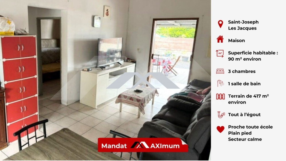 MAXImmo vous propose cette mignonne maison F4 plain-pied d'environ 90 m² habitable, édifiée sur une parcelle raccordée au tout à l'égout d'environ 417 m², dans le quartier paisible des Jacques à Saint Joseph.