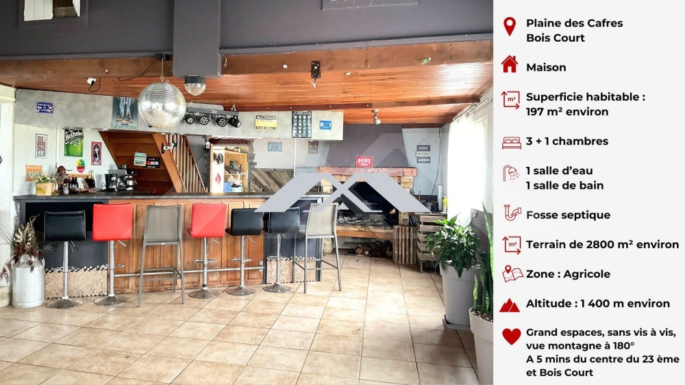 MAXImmo vous propose cette maison F5 d'environ 197 m², de 2003, avec permis de construire, édifiée sur une parcelle d'environ 2800 m² 'bornée', composée de trois chambres, un bureau, un cellier, une salle de bain et douche, une grande salle de réception, une cheminée, une véranda, un comble aménageable.