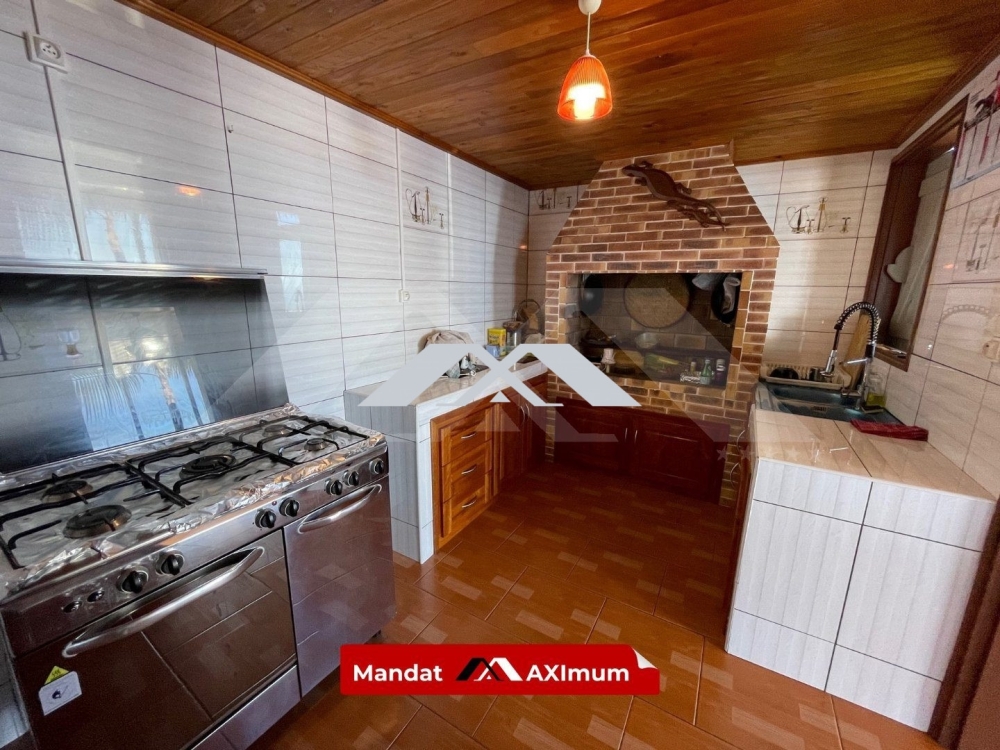 Elle se compose au rez-de-chaussée d'une véranda avec vue mer (22,75 m² environ), d'une cuisine au feu de bois (9,35 m² environ), d'une salle à manger (16,74 m² environ).