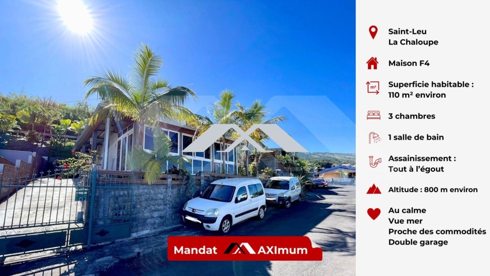 MAXImmo vous propose cette maison F4 située dans une impasse à notre Dame des Champs (la Chaloupe Saint-Leu), à 800 mètres d'altitude, et à environ 15 min de la route des Tamarins.