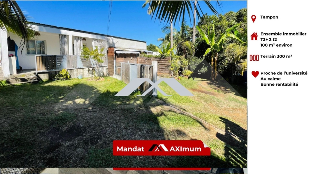 MAXImmo vous propose sur le secteur du Tampon, cet ensemble immobilier de trois appartements plein-pied, idéalement situé à proximité immédiate de l'université et de toutes les commodités, offrant un potentiel pour investisseurs.