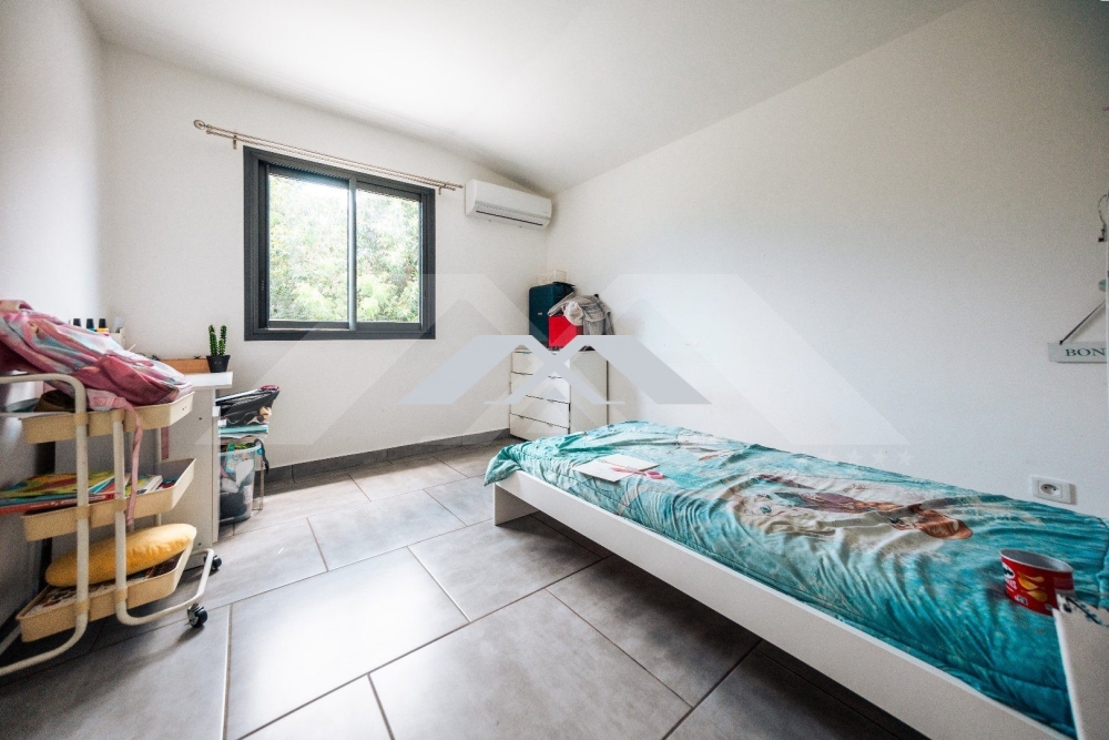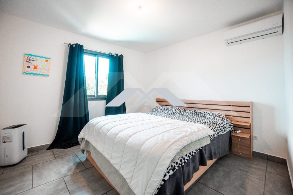 La maison offre un spacieux salon ouvert sur une cuisine entièrement équipée, créant un espace de vie convivial et lumineux. La chambre parentale dispose d'un accès direct à une terrasse, offrant une vue dégagée sur les environs.
