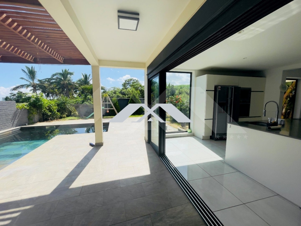 Cet espace donne sur une terrasse couverte, idéale pour des moments de détente avec une piscine pour parfaire ce cadre convivial.