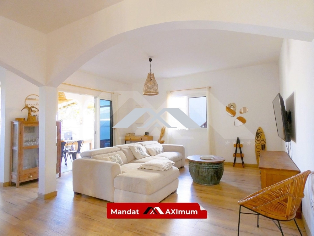 Lumineuse et parfaitement agencée, elle se compose, au rez-de-chaussée, d'une spacieuse pièce de vie d'environ 45 m² avec cuisine ouverte, avec accès direct sur une charmante varangue.