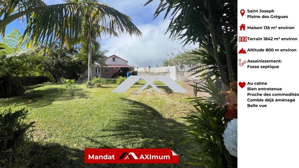 MAXImmo vous propose cette maison de type F5 d'environ 135 m² dans les hauteurs de Saint Joseph ( Plaine des Grègues) composée de deux belles chambres, un grand salon, une grande cuisine aménagée, une jolie salle de bain avec douche à l'italienne, un wc, une grande salle télé et une partie des combles déjà aménagée, une chambre espace télé, bureau).