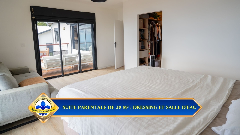 SUITE PARENTALE DE 20 M² : Espace privilégié avec dressing sur mesure intégré et salle d'eau privative. La douche à l'italienne et l'accès direct à la terrasse complètent ce havre de paix.