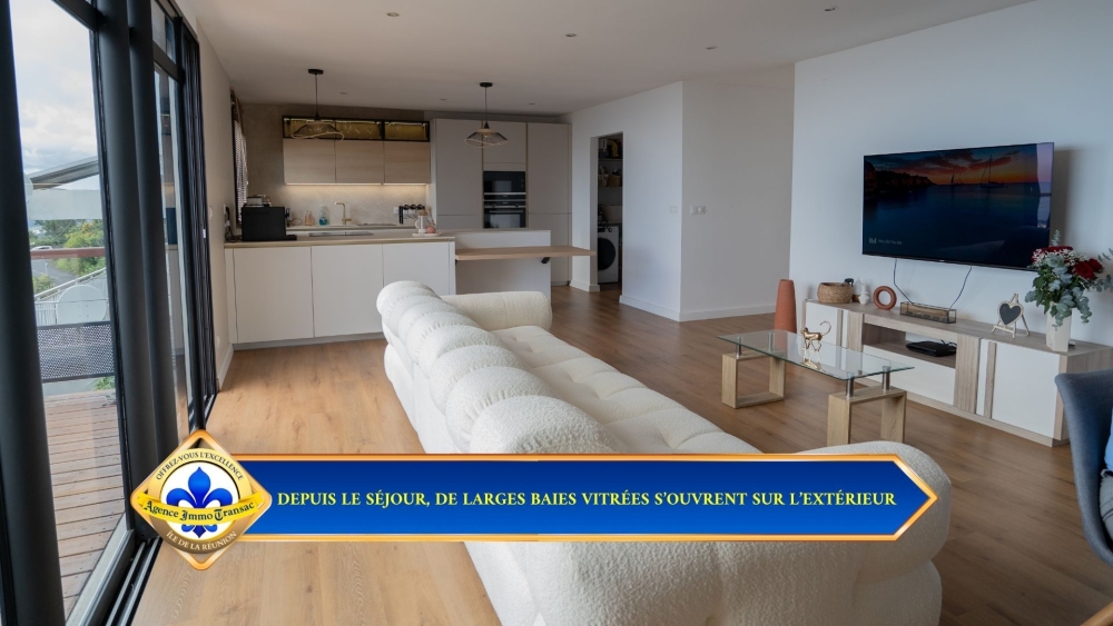 SÉJOUR LUMINEUX ET SPACIEUX : Les grandes baies vitrées prolongent l'espace vers la terrasse de 50 m². La circulation fluide entre intérieur et extérieur crée un espace de vie unique.