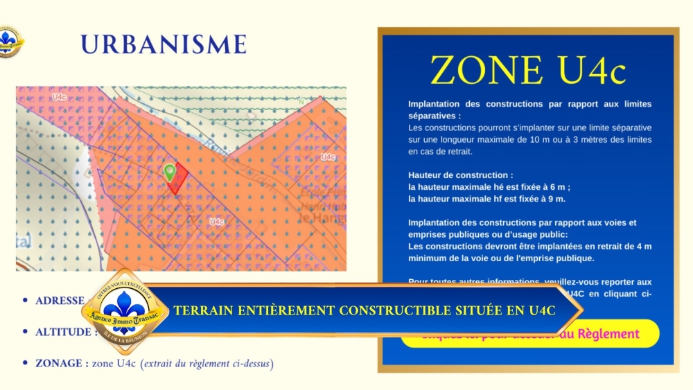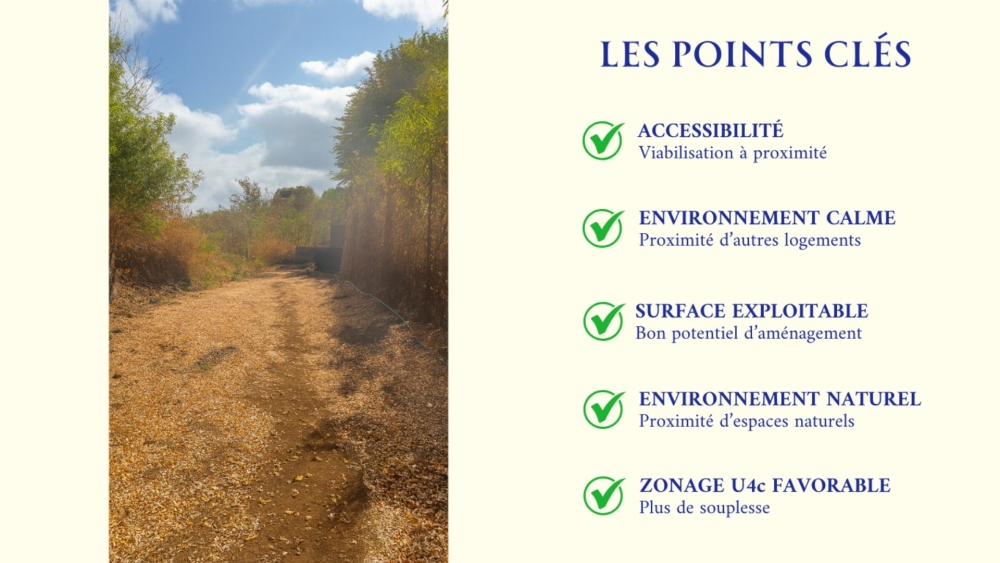 ZONAGE U4c : Situé en zone U4c, ce terrain permet une construction résidentielle R+1 avec combles, retrait de 4m de la voie et 40% d'emprise au sol maximum.
