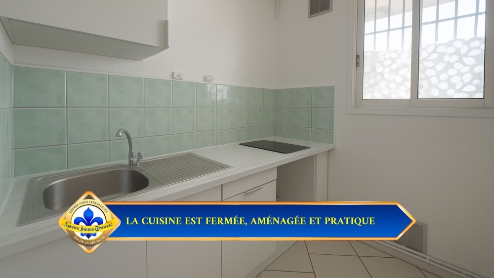 CUISINE AMÉNAGÉE ET FERMÉE : Entièrement équipée avec des MEUBLES modernes et un PLAN DE TRAVAIL fonctionnel, cette cuisine fermée combine praticité et lumière naturelle.