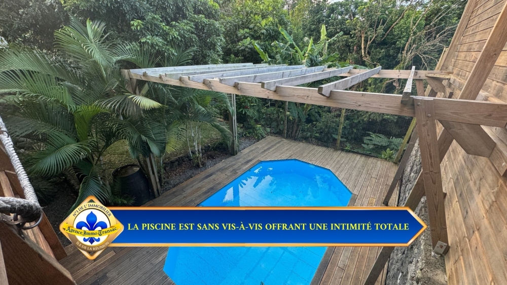 PISCINE SANS VIS-À-VIS : Nichée dans un écrin de verdure, la piscine est bordée d'un deck en bois et entourée de plantes exotiques. Cet espace est conçu pour garantir une intimité totale et une détente absolue.