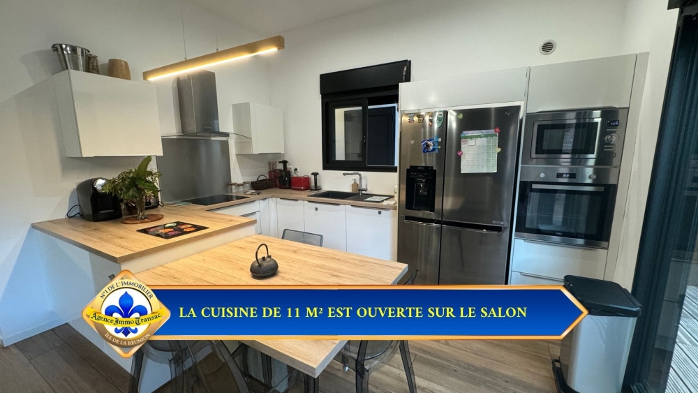 CUISINE MODERNE ET ÉQUIPÉE : La cuisine ouverte de 11 m² est aménagée avec des placards blancs et un plan de travail en bois clair. Dotée d'appareils modernes en acier inoxydable, elle allie design et fonctionnalité pour répondre aux exigences d'une maison de prestige.