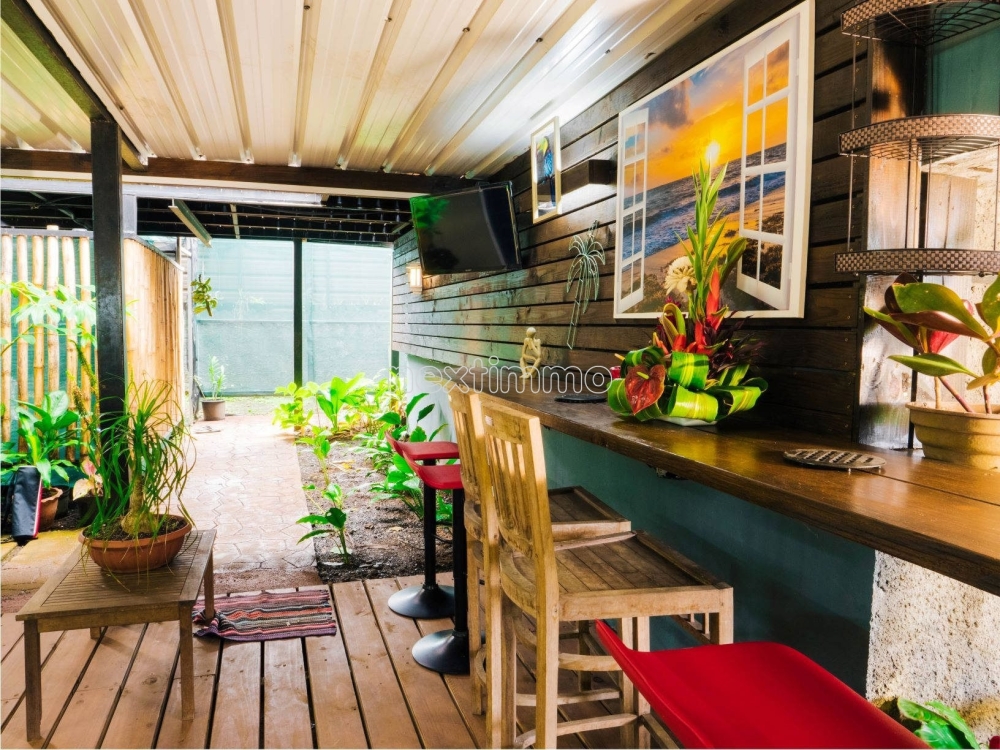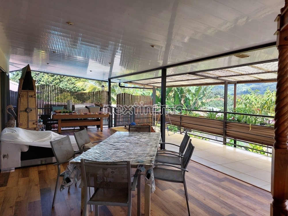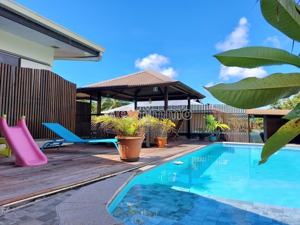 Dans un cadre verdoyant, joli terrain agréablement arboré d'arbres fruitiers, vous disposerez d'un garage couvert 2 véhicules avec son atelier, 1 Fare Pote, 1 salle de sport, 1 Four Tahitien.