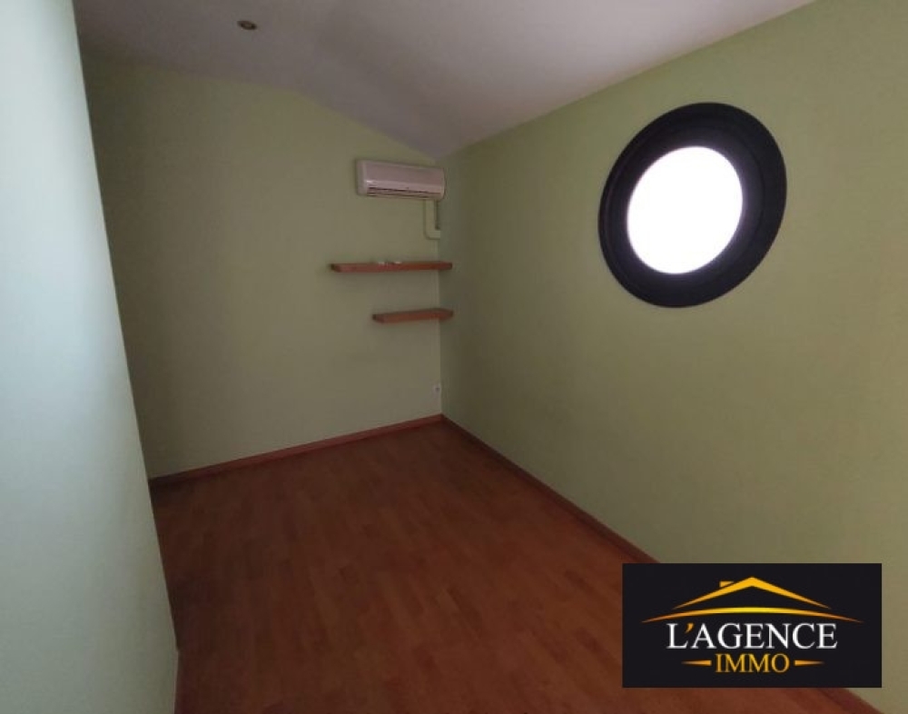 A l'étage, une chambre climatisée avec placards, une pièce attenante pouvant faire office de bureau ou de chambre pour enfant, une salle de bain et un WC indépendant.