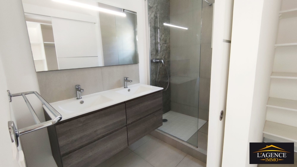 Spacieux appartement F3 de 75 m² bénéficiant d'un environnement calme et agréable. Il dispose d'un séjour avec cuisine équipée, de deux chambres climatisées dont une avec dressing et salle d'eau, d'une seconde salle d'eau et d'un WC.