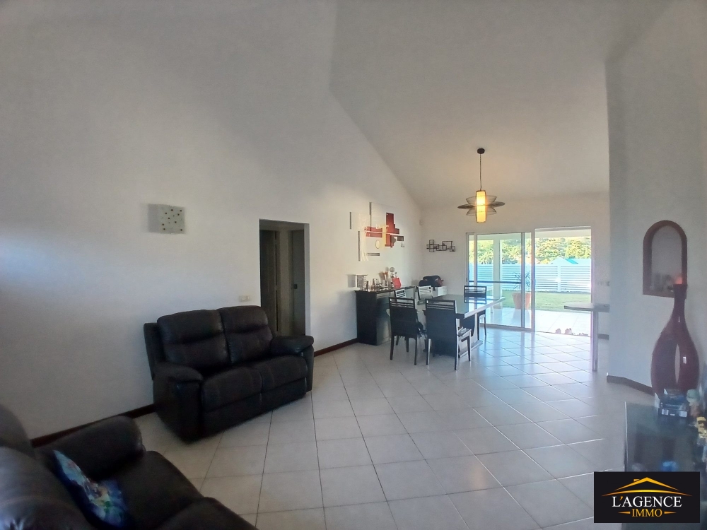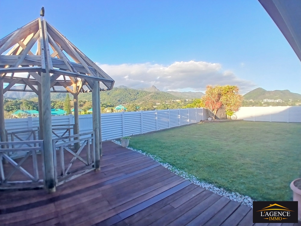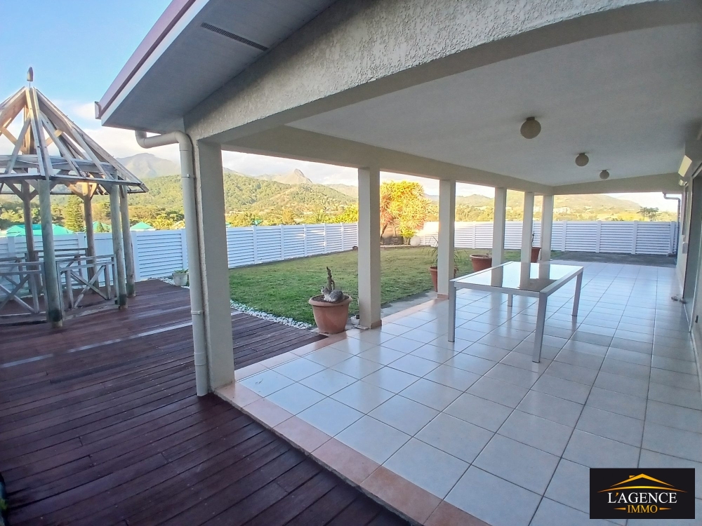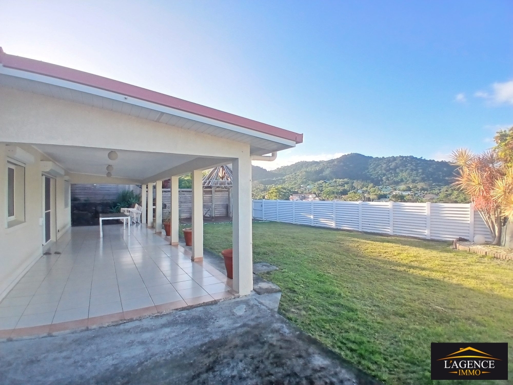 Vous profiterez également d'une spacieuse terrasse couverte de 42 m², ouverte sur un jardin arboré avec coin faré, offrant une vue dégagée sur le Pic Malawi.
